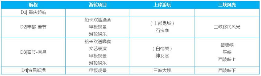 長(zhǎng)江藍(lán)鯨號(hào):重慶-宜昌(周一晚登船,21:30開(kāi)航)、宜昌-重慶(周四晚登船,周六開(kāi)航)
