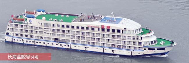 曾經(jīng)如一條藍(lán)色的鯨魚游弋在長(zhǎng)江上,如今的五星級(jí)豪華游輪“藍(lán)鯨號(hào)”經(jīng)過(guò)全面裝修和改造,寬敞并帶有外陽(yáng)臺(tái)的客房使藍(lán)鯨的個(gè)性與長(zhǎng)江的自然風(fēng)光完美融合,令“宿”更加舒適;大面積的公共區(qū)域令“游”更加自在,給游客提供了最美好的空間去傾聽(tīng)大自然的聲音、感受峽谷中的幽香。藍(lán)鯨號(hào)裝備一流的GPS、測(cè)探儀、雷達(dá)等現(xiàn)代化通訊導(dǎo)航設(shè)備,開(kāi)創(chuàng)了長(zhǎng)江游輪先進(jìn)儀器配備和建造格局的新時(shí)代。藍(lán)鯨號(hào)殷勤細(xì)致的服務(wù)為游客營(yíng)造了溫馨舒適的環(huán)境。精美的西點(diǎn)令人咂舌;中餐之川菜和淮揚(yáng)菜制作之地道常令世界各國(guó)賓客贊許。