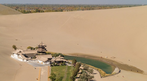 敦煌的另一個王牌景點。因在沙漠之中有一灣形似月牙的泉水,漣漪縈回,碧如翡翠,千百年來,泉在流沙中,不干旱不枯竭,風(fēng)吹沙不落的奇景吸引著眾多的游人。進(jìn)入景區(qū),一眼望去的茫茫大沙漠還有那一座座沙山,怎能止住你奔騰的心和盡情翻滾的沖動。月牙泉被沙山包圍著,那么一個小小的綠洲,千百年來依舊波光粼粼,怎么琢磨都是件神奇的不可思議的事。在這里,你可以體驗到沙漠駝隊,駝鈴聲聲,仿佛夢回漢唐時期西域通商盛景一般。